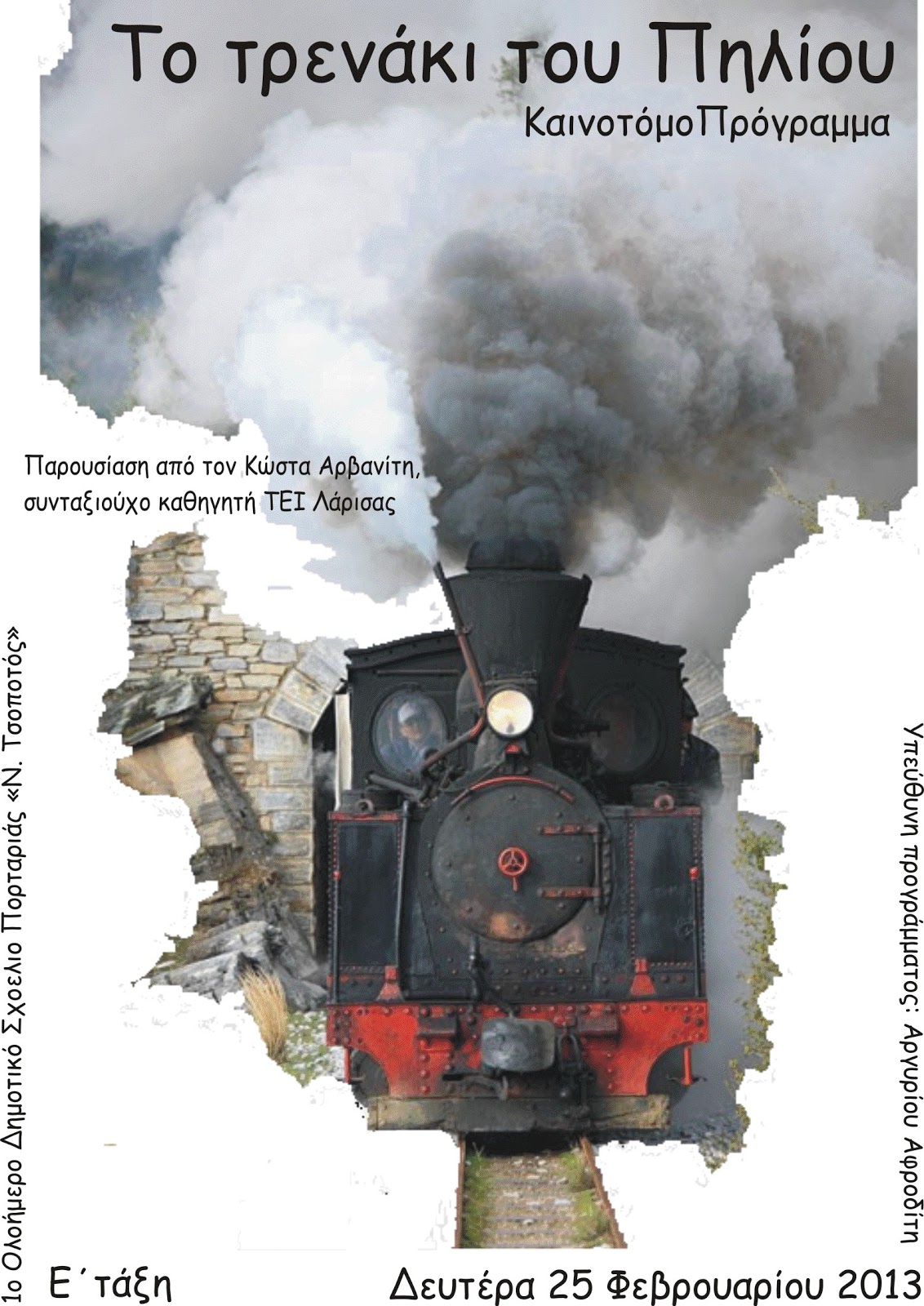 Ένα από τα καινοτόμα προγράμματα που υλοποιούνται στο σχολείο μας για το σχολικό έτος 2012 - 2013 αφορά "Το τρενάκι του Πηλίου". Στα πλαίσια της υλοποίησης του τη Δευτέρα 25 Φεβρουαρίου 2013 θα φιλοξενήσουμε στο σχολείο μας τον συνταξιούχο καθηγητή των ΤΕΙ Λάρισας κ. Αρβανίτη Κωνσταντίνο που θα παρουσιάσει στους μαθητές της Ε τάξηςτο τρενάκι του Πηλίου από το ξεκίνημα της κατασκευής του σιδηροδρομικού δικτύου του Πηλίου μέχρι σήμερα .