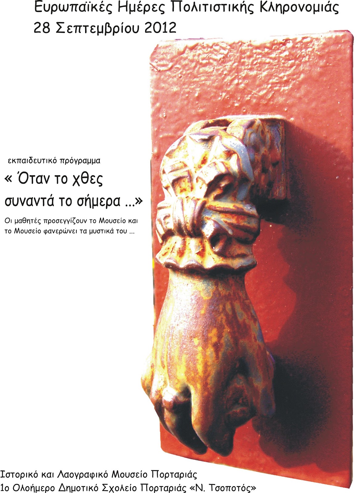 Στα πλαίσια του εορτασμού των Ευρωπαϊκών Ημερών Πολιτιστικής Κληρονομιάς 2012 το Σχολείο μας σε συνεργασία με το Μουσείο Πορταριάς και την αρχαιολόγο κ. Πόλυ Καρενά θα υλοποιήσουν την Παρασκευή 28/9/2012 το εκπαιδευτικό πρόγραμμα " Όταν το χθες συναντά το σήμερα ...". Το πρόγραμμα στοχεύει στην προσέγγιση του Μουσείου από τους μαθητές, την γνωριμία με το περιβάλλον του και την ανάδειξη των επιμέρους θεματικών περιοχών του αξιοποιώντας τη βιωματική μάθηση και την ομαδοσυνεργατική διδασκαλία. Οι μαθητές θα εκφραστούν χρησιμοποιώντας εργαλεία και πρακτικές από το χώρο της τέχνης.