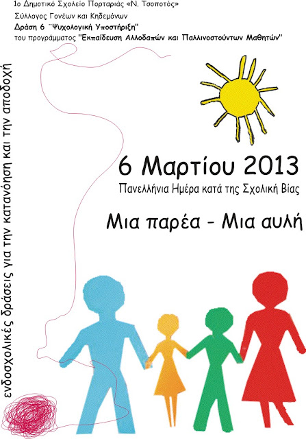 Το Δημοτικό Σχολείο Ιωλκού και το 1ο Δημοτικό Σχολείο Πορταριάς σε συνεργασία με τους Συλλόγους Γονέων συνδιοργανώνουν τη Δευτέρα 22/04/2013 δράση για τους γονείς με θέμα το σχολικό εκφοβισμό. Στο πλαίσιο της δράσης αυτής θα γίνει παρουσίαση - ομιλία από τον ψυχολόγο και θα οργανωθούν βιωματικές ασκήσεις από την εκπαιδευτικό – ειδική παιδαγωγό . Ο Άρης Γκανούρης και η Ελένη Μπαρμπουδάκη εργάζονται στο 1ο Ολοήμερο Δημοτικό Σχολείο Πορταριάς με το πρόγραμμα ΔΙΑΠΟΛΙΣ «Εκπαίδευση Αλλοδαπών και Παλινοστούντων Μαθητών» στις Δράσεις 6 και 1 αντίστοιχα.